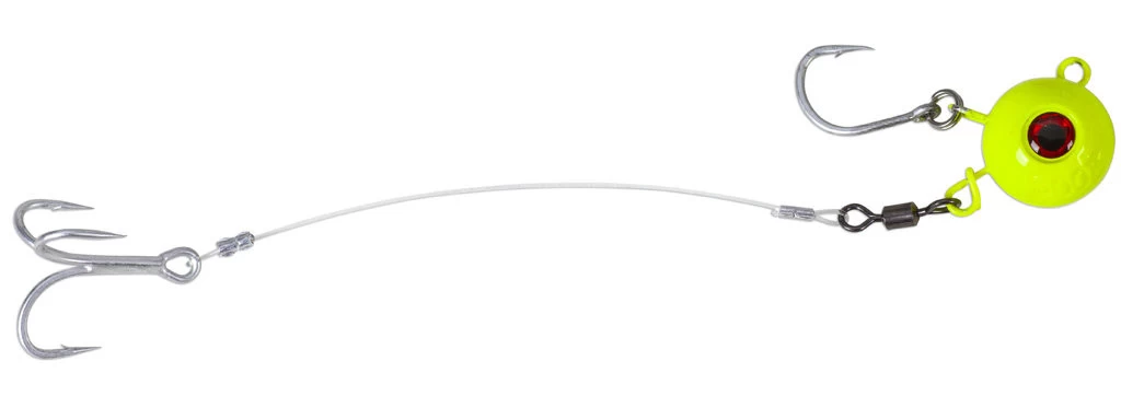 Schweres Fireball System für die Meeresangelei. Geliefert wird das System mit Bleikopf sowie einem mittels Sprengring montiertem Haken und einem Fluorocarbon-Stinger mit Drilling in Größe 4/0. Zusätzlich ist ein spezieller Austauschhaken im Lieferumfang enthalten, der bei der Verwendung von z. B. Gummiködern zum Einsatz kommt. Alle Haken sind mit einer rostfreien Beschichtung versehen. Der Stinger kann einfach durch das am Bleikopf angebrachte Quick Change System montiert werden. Zudem ist der Bleikopf mit einem fluoreszierenden Lack versehen. Das System gibt es in den Gewichten von 200g bis 500g.