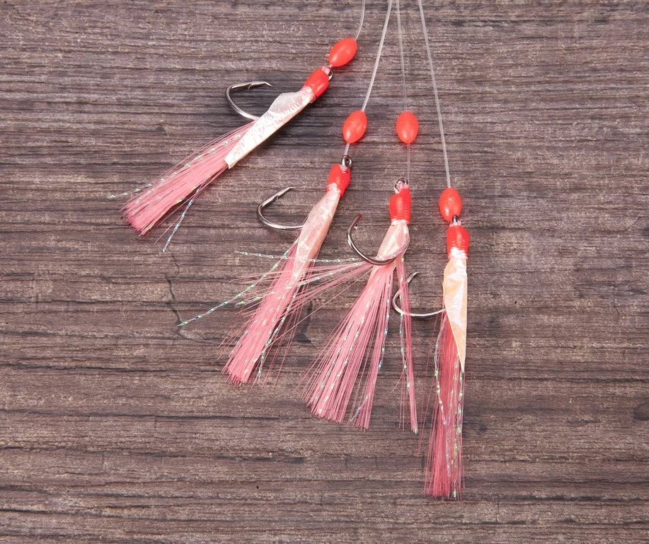 Dieses Heringsvorfach gibt es mit drei unterschiedlichen Hakengrößen. Es besitzt vier Circle Hooks, welche mit Fischhaut und rosafarbenen Federn bestückt sind. Es gibt das Vorfach in der Hakengröße 8, 6 und 4.
