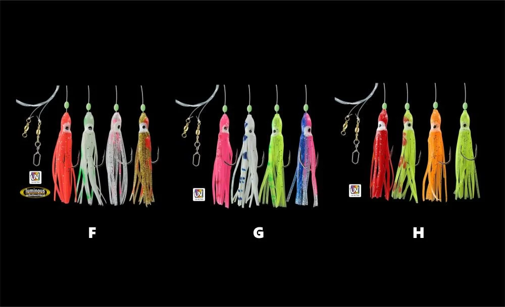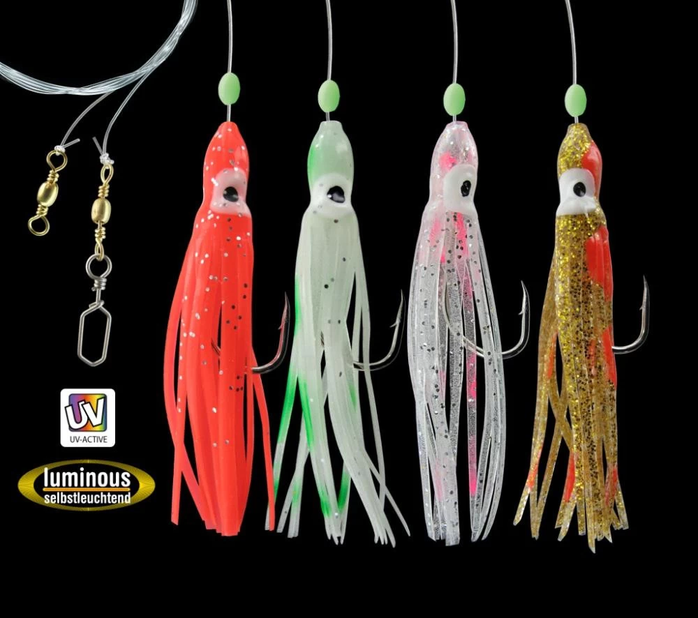Dies ist ein Octopus System mit 4 Seitenarmen an denen kleine Octopusse und kräftigen Einzelhaken befestigt sind. Es ist damit ideal zum Meeresfischen. Spezial selektierte Farbvarianten mit Glitter sowie UV-Aktivität sorgen für optimalen Erfolg an Nord- und Ostsee.