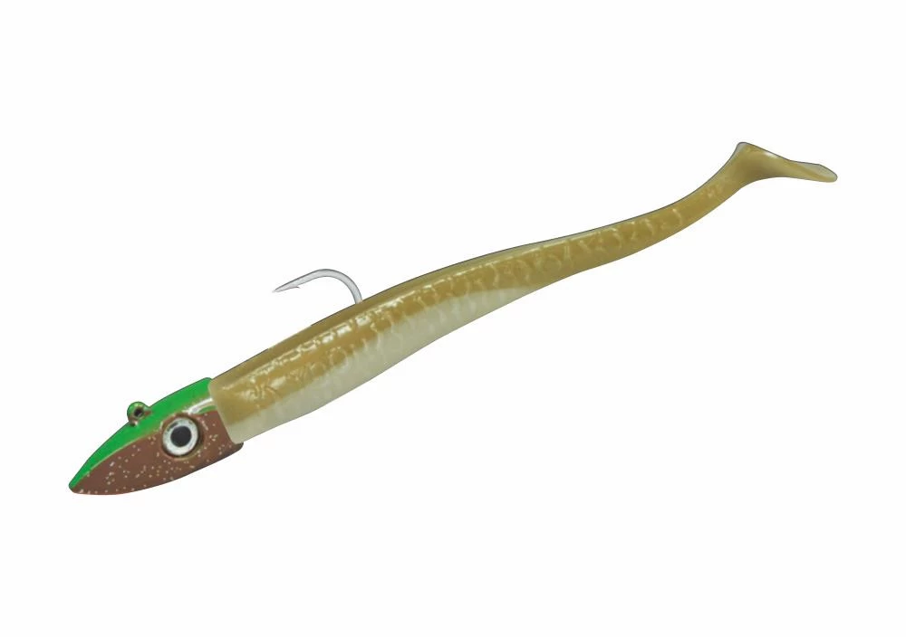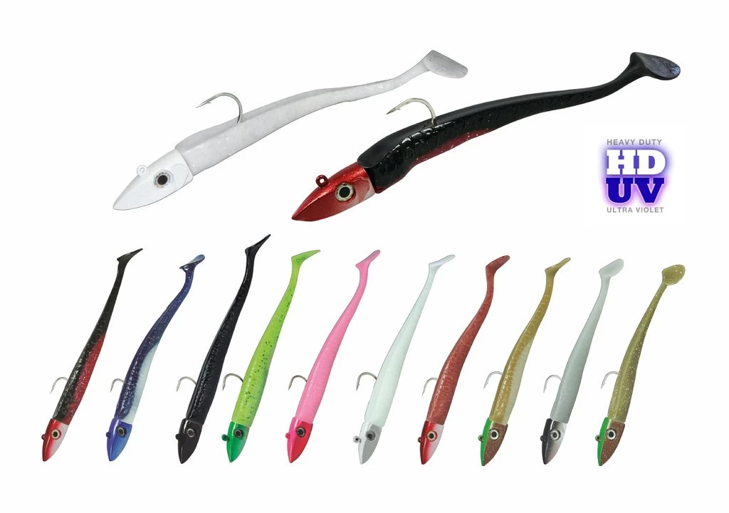 Dieser Gummiköder besteht aus dem Twitcher Jigkopf, der ideal für alle Sandaalimitationen ist, und dem Hogy Paddel in der Variante HDUV. Der Jigkopf ist mit einem verzinnten 60° VMC High Carbon Jig-Head Haken mit ultrascharfer Spitze ausgestattet. Dieser Köder ist ideal für die Präsentation im Freiwasser. Der Paddelschwanz sorgt für ausreichend Druck und Aufmerksamkeit, die durch die UV-Kunststoff- und Glitterplättchen noch enorm gesteigert wird. Horizontal angeboten werden flankierende Bewegungen auf Zug an der Rutenspitze zu wirklich lebendigen Bewegungen im Köder. Abwechselnd links und rechts flankiert der Köder tanzend das Wasser und bekommt das verführerische Spiel eines lebendigen Sandaals. Die Jigköpfe sind farblich auf die Paddelschwänze abgestimmt. Dieser Kunstköder ist in vielen verschiedenen Farben und Gewichten von 100g bis 185g erhältlich.