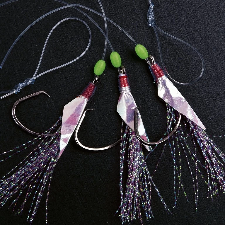 Dieses Vorfach besteht aus drei Circle-Hooks der Größe 3/0. Montiert ist alles auf einer 0,60mm starken und 150cm langen monofilen Schnur. Die Haken sind mit silberglänzenden Federn und Folie verziert. Vor jedem Haken sitzt eine ovale Leuchtperle.