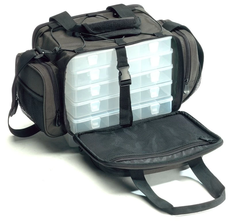 Die Angeltasche wird mit 5 Köder- und Zubehörboxen geliefert. Somit lassen sich eine Menge an Angelzubhör wie Kunstköder, Wirbel, Haken oder Jigs verstauen. Sehr praktisch sind auch ihre zusätzlichen Außen- und Netztaschen. Auch diese Tasche ist rundum gepolstert.