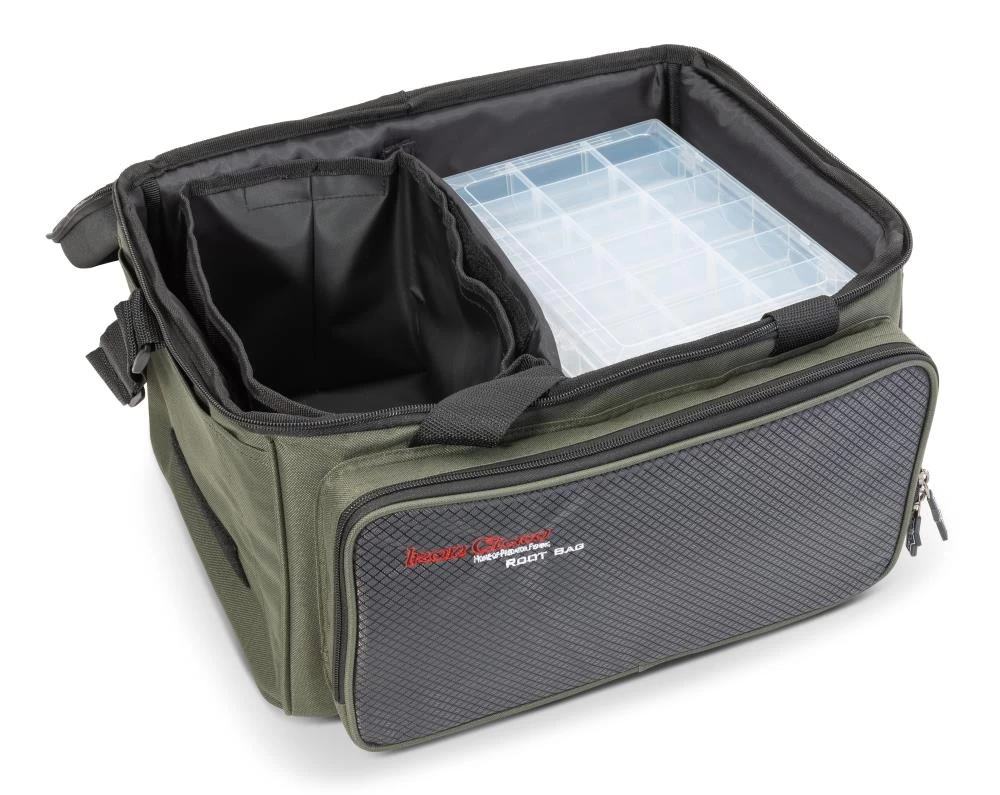 Hier handelt es sich um eine große Basistasche, die ein großes Hauptfach besitzt, welches die Möglichkeit der Unterteilung besitz. Zusätzlich wird die Tasche mit vier Boxen geliefert wird. Zudem ist im Hauptfach auch ein herausnehmbarer, wasserdichter Einsatz untergebracht. Außen sind zwei abnehmbare Seitentaschen und eine aufgesetzte Fronttasche angebracht. Der obere Teil der Tasche ist aus versteiftem Material wie ein Tisch aufgebaut und bietet so die Möglichkeit, z.B. Utensilien zur Vorfachmontage oder andere Kleinigkeiten abzulegen.