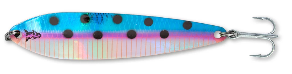 Ein ungewöhnlich schwerer Schleppblinker als etwas dickerem Blech, der mit einem ungewöhnlichen Lauf fasziniert. Der Grund liegt darin, weil der Salmon Doctor mit dem breiten Blechbereich zum Wirbel hin montiert wird und das schlanke Ende den Haken trägt. Der Lauf unterscheidet sich grundsätzlich von dem anderer üblicher Schleppblinker und punktet somit oft, wenn die Fische von anderen Modellen schon einfach zu viele vor der Nase gehabt haben. Mit dem Plus an Gewicht ist der Salmon Doctor zudem ausgezeichnet geeignet für das Long Lining oder an Planer Boards. Diesen Schleppköder gibt es in acht fängigen Dekors und drei Größen von 110m – 156mm.
