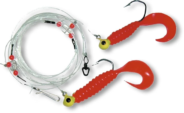Dieses Doppel-Twister-Vorfach besteht aus zwei roten 5,5cm großen Twistern, welche an einer 0,65mm starken Vorfachschnur befestigt sind. Diese wiederum ist an eine 0,70mm starke Hauptschnur geknotet. Das Vorfach gibt es in Hakengröße 2/0 oder 3/0.