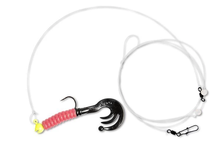 Dies ist ein Pilkvorfach mit Einzeltwister. Der Twister hat eine Länge von 7,5cm und ist an einem 3,5g schweren LOOky Jig Head befestigt. Die Farbe ist Rot/Schwarz. Die Schnurstärke ist 0,50mm und wird mit einer Tragkraft von 17kg angegeben. Der Abstand zwischen Bodenwirbel und dem 23cm langen Seitenarm beträgt 50cm. Der verwendete Jigkopf besitzt einen Haken der Größe 3/0.