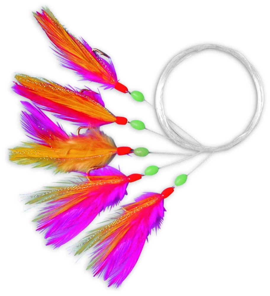 Dieses Vorfach besteht aus 5 Haken der Größe 1/0, welche mit farbigen Federn verziert sind. Vor dem Haken sind Leuchtperlen montiert. Alles zusammen ist mit einer 0,7mm starken monofilen Schnur verbunden. Verfügbar ist das Vorfach in unterschiedlichen Farben.